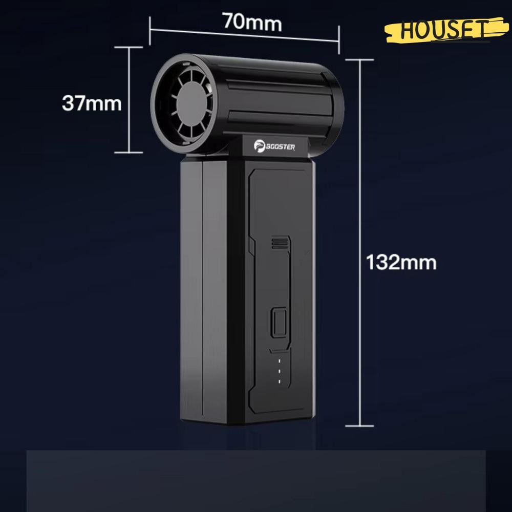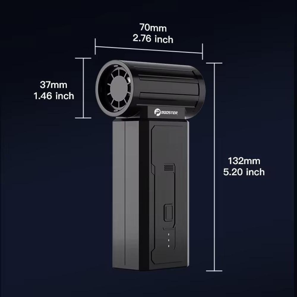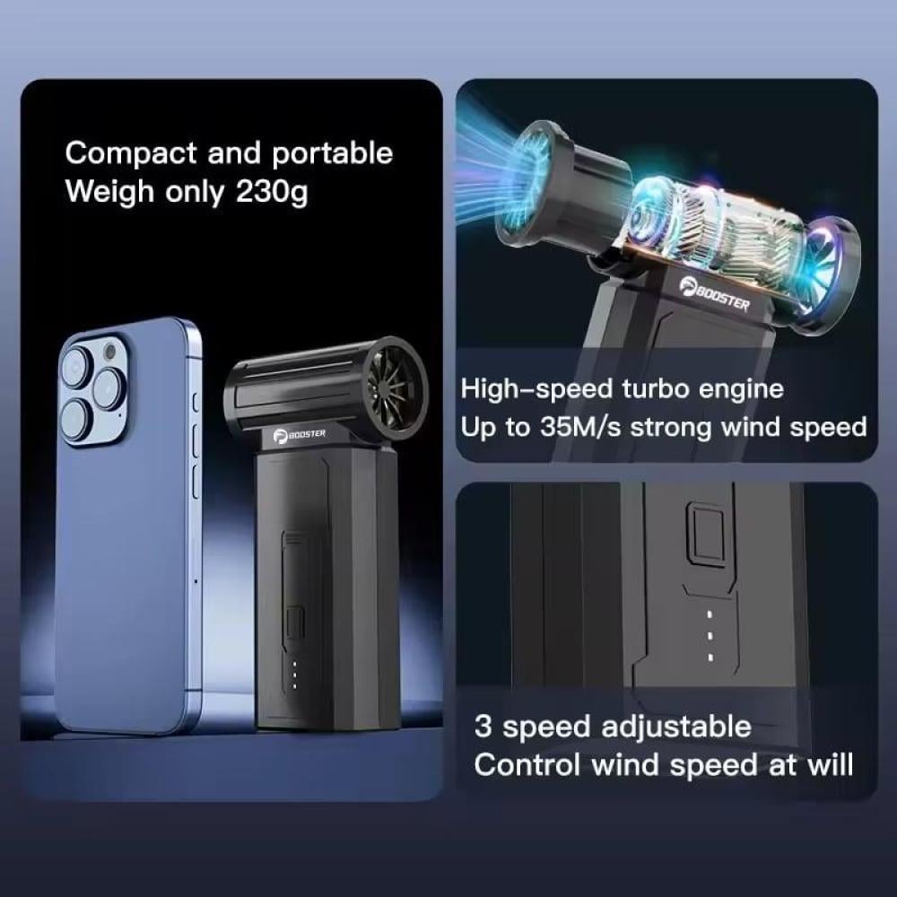 منفاخ من شركة BOoster صغير الحجم بتصميم عصري وانسيابي، يتميّز بمظهر متين وعملي يناسب الاستخدام اليومي أو أثناء السفر. يأتي بشكل أسطواني في الجزء العلوي مزود بمروحه صغيرة